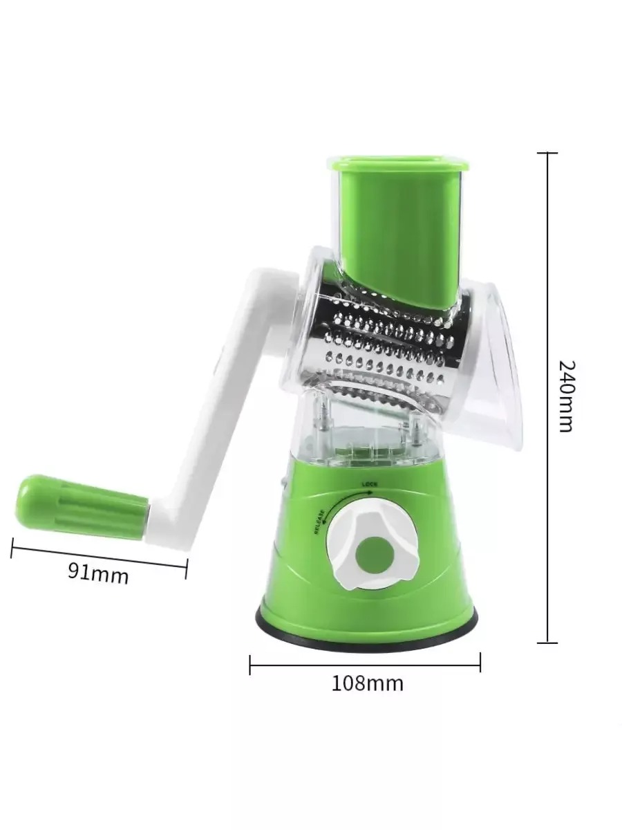 Овощерезка ручная терка с тремя насадками - это удобный и эффективный инструмент для нарезки овощей и фруктов всех видов. Большой бункер для продуктов позволяет переработать большой объём продуктов за короткое время, а толкатель сбережёт ваши пальцы от порезов. Терка оснащена ручкой для удобства использования и резиновым основанием с возможностью надежной присоски к гладкой поверхности.