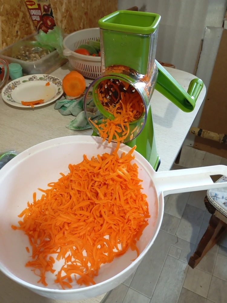 Шикарная овощерезка, никакой терки не нужно, за минуту нарезали пять морковок, очень нужная вещь в хозяйстве. Моется легко, собирается легко, крутится легко))